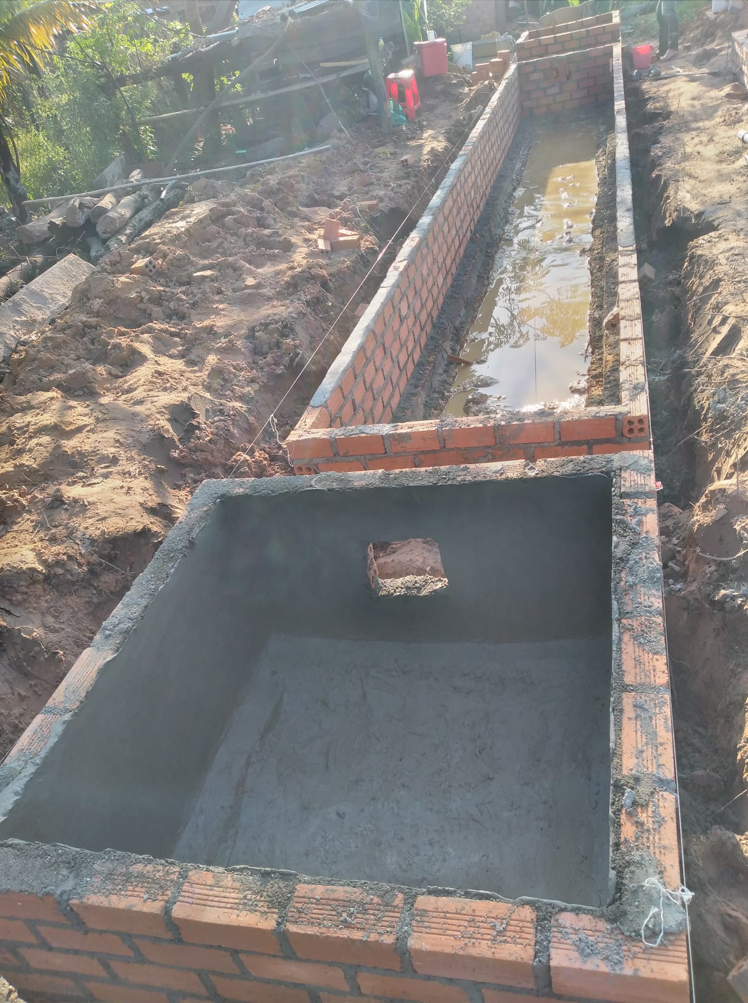 - Đào hoặc xây hố kích thước: Rộng 1m, sâu 0.8 – 1m, dài 9.5m