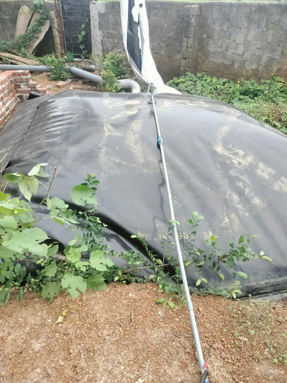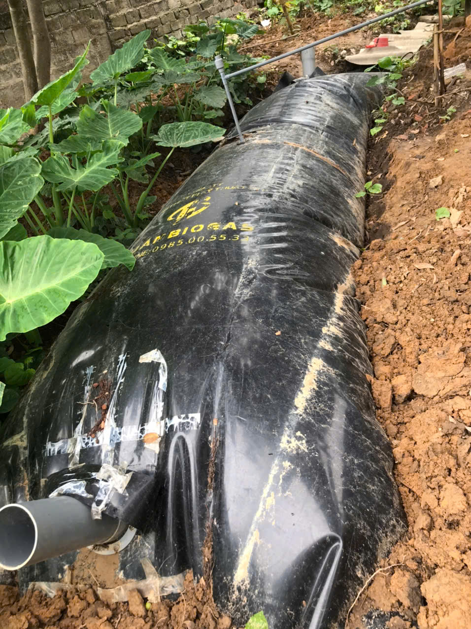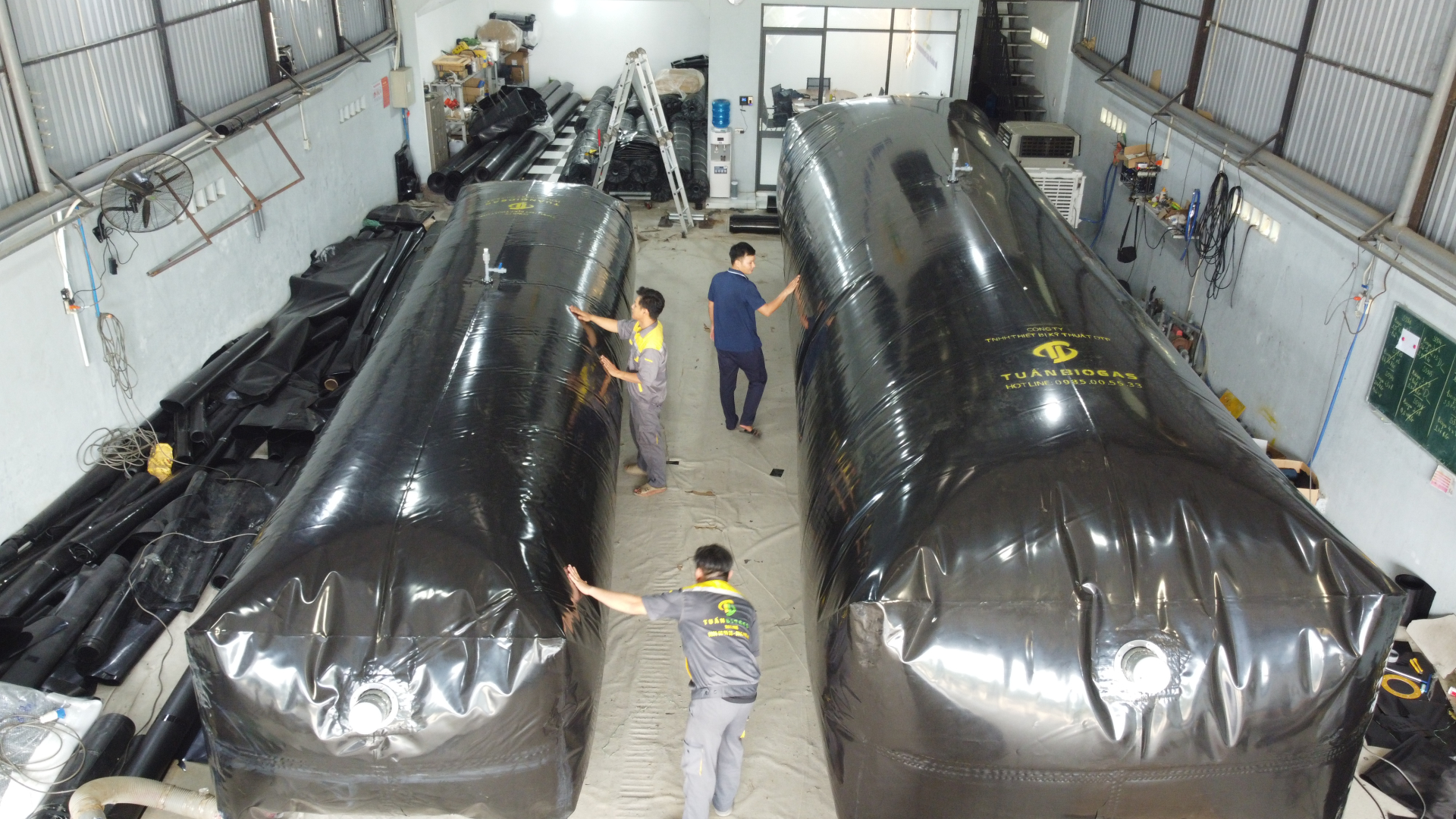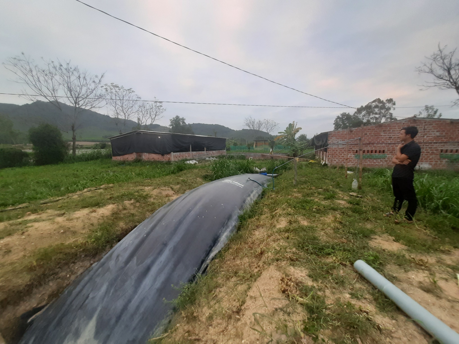 Cho chất thải vào, chờ có ga – Làm xong là cho phân, nước thải vô túi, tầm 1–2 tháng là túi phồng lên, có khí đốt nấu ăn được.