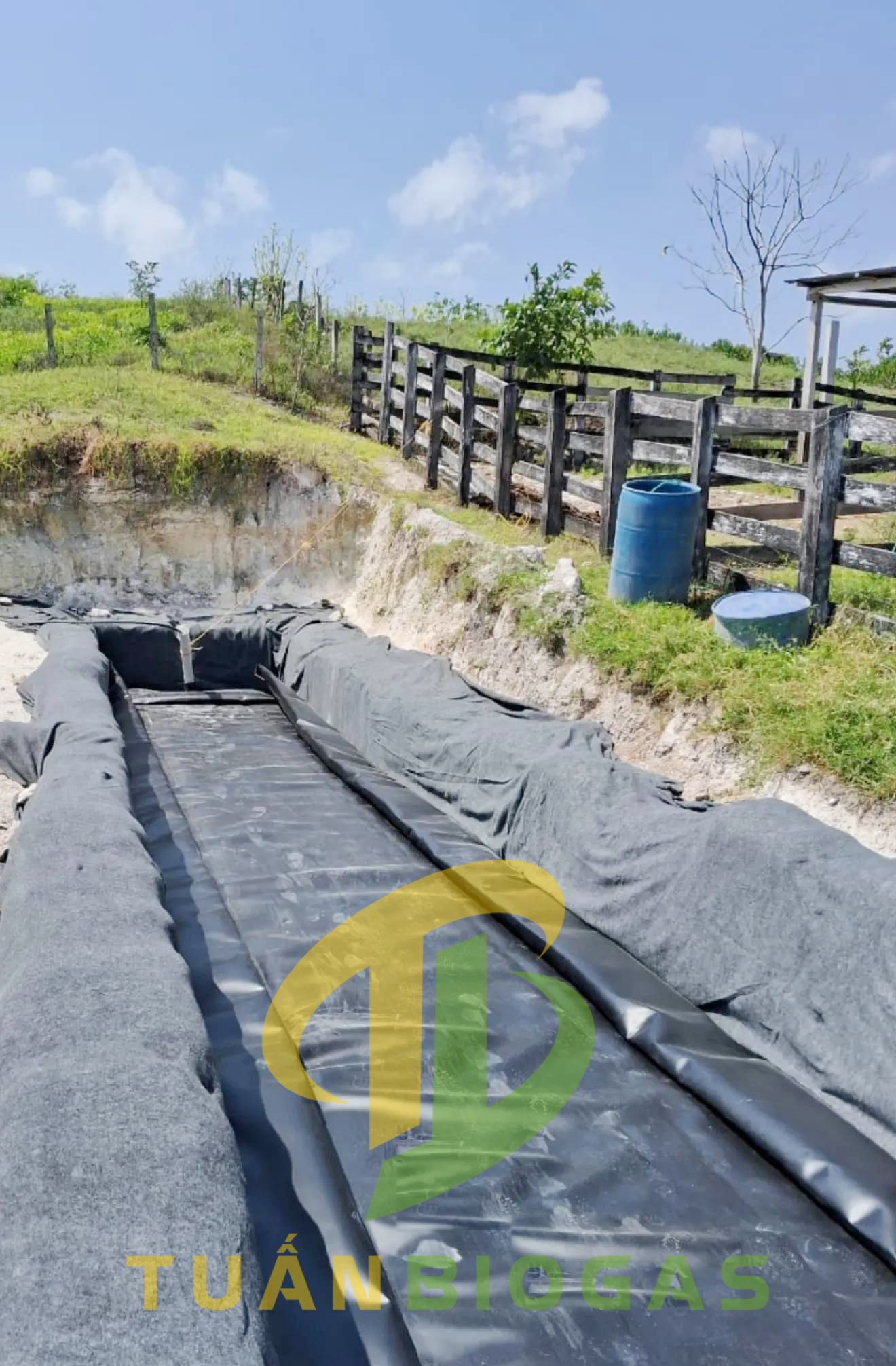 Trải túi biogas xuống hố – Trải túi ngay giữa hố, canh cho thừa đều hai bên.