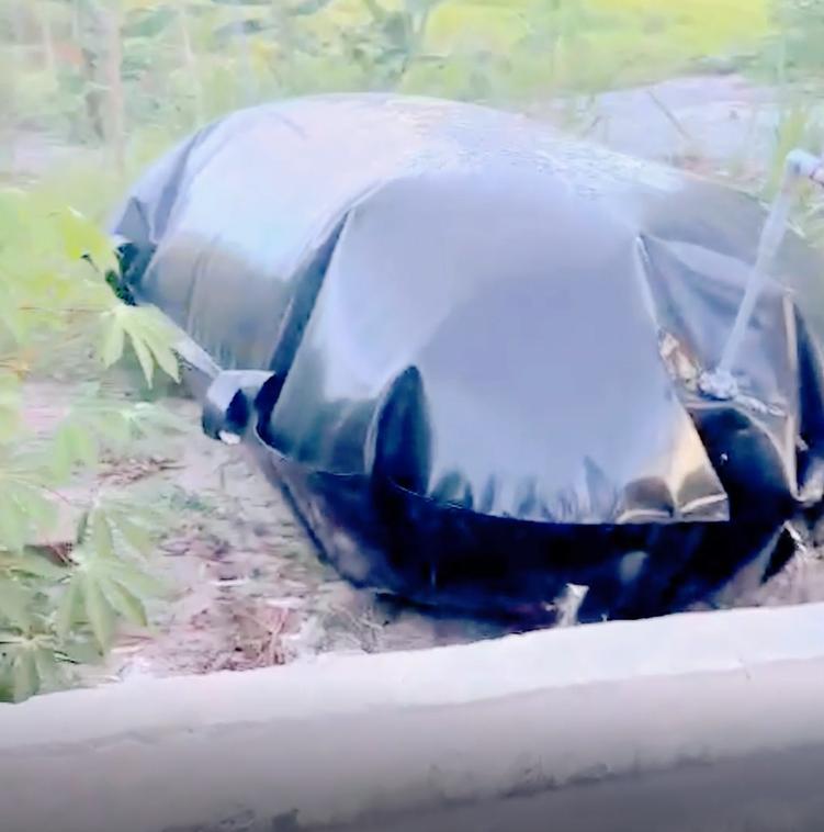 Trong video thực tế, hệ thống túi biogas 30 khối được lắp đặt gọn gàng trong khuôn viên vườn nhiều cây cối. Túi ở trạng thái căng phồng, cho thấy khả năng sinh khí và chịu áp lực rất tốt.